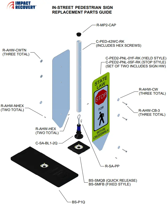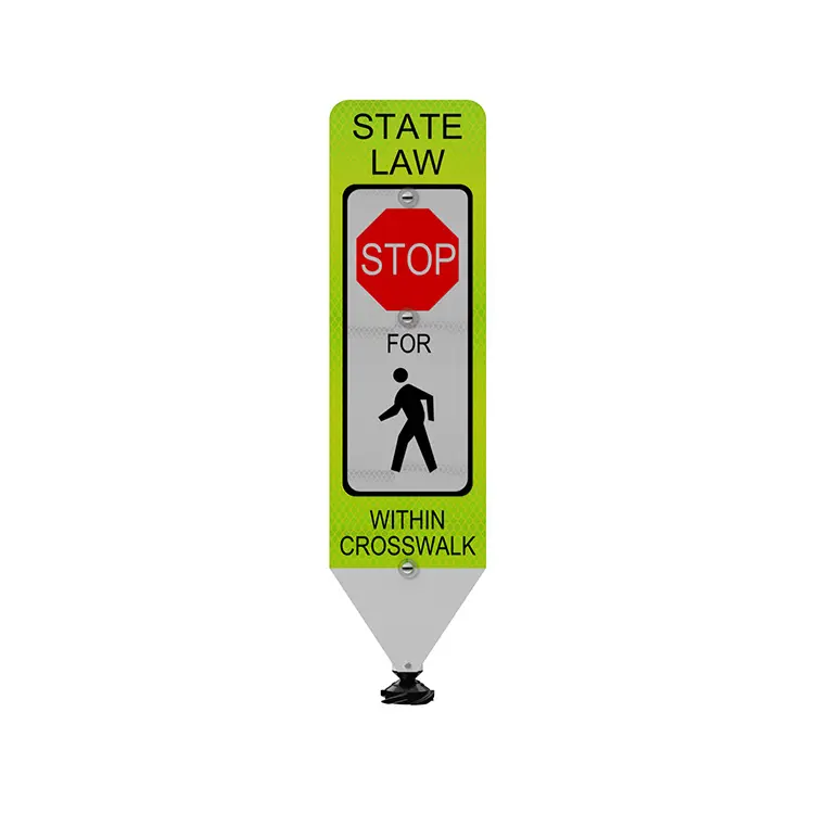 Highly reflective in-street pedestrian crosswalk signs are helpful in alerting distracted drivers of pedestrian crossing zones. They provide enhanced conspicuity at non-signalized intersections and mid-street crossings to alert motorists to local laws concerning yielding to, or stopping for, pedestrians in crosswalks.